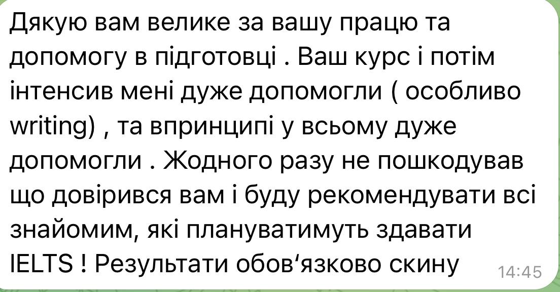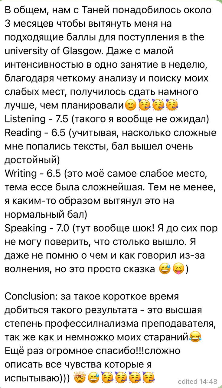 Результат моих студентов — рост на 0.5–1.5 балла по частям IELTS и успешное поступление или иммиграция.