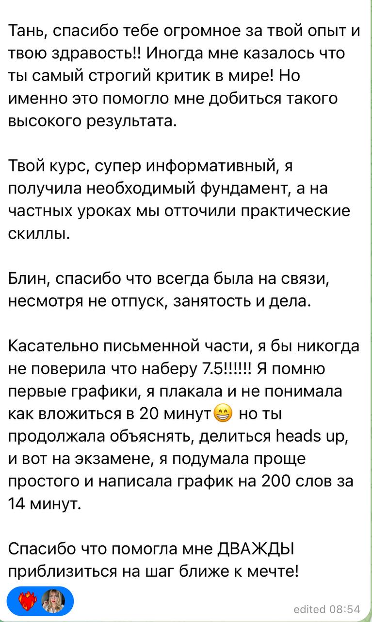 Привет! Меня зовут Татьяна — я IELTS-Coach, педагог высшей категории, автор курса "IELTS of your Dream". Каждые полгода сама сдаю IELTS на 7.0+ (последний результат — 8.0 Academic), регулярно прохожу симуляции и консультируюсь с экс-экзаменаторами, чтобы мои студенты знали самые свежие нюансы.
